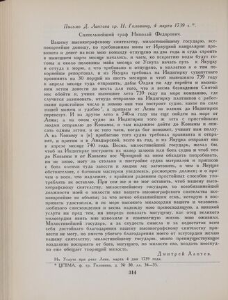 Письмо Д. Лаптева гр. Н. Головину, 4 марта 1739 г. // ЦГВМА, ф. гр. Головина, д. № 30, лл. 34-35.