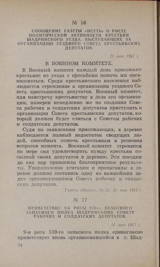 Сообщение газеты «Исеть» о росте политической активности крестьян Шадринского уезда, выступающих за организацию уездного Совета крестьянских депутатов. 21 мая 1917 г. В военном комитете // Газета «Исеть», № 51, 21 мая 1917 г.