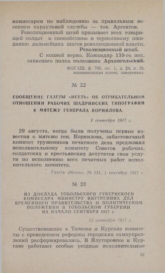 Из доклада Тобольского губернского комиссара министру внутренних дел Временного правительства о политическом положении в Тобольской губернии на начало сентября 1917 г. 15 сентября 1917 г. // ФОГАТ, ф. 512, oп. 1, д. 98, л. 78, машинописный отпуск.