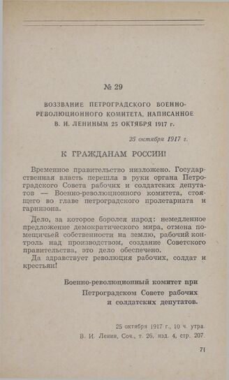 Воззвание Петроградского военно-революционного комитета, написанное В. И. Лениным 25 октября 1917 г. К гражданам России! // В. И. Ленин, Соч., т. 26, изд. 4, стр. 207. 25 октября 1917 г.