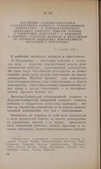 Обращение Западно-Сибирского объединенного комитета революционной демократии и Западно-Сибирского областного комитета Советов рабочих и солдатских депутатов с призывом к рабочим, солдатам, казакам и крестьянам об активной поддержке вооруженного восстания в Петрограде. 27 октября 1917 г. К рабочим, солдатам, казакам и крестьянам // Газета «Новый мир», № 1, 29 октября 1917 г. Экстренный выпуск.