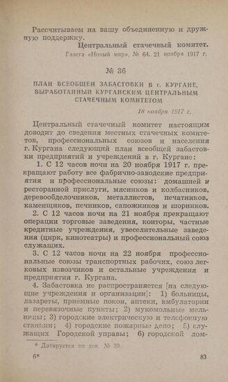 План Всеобщей забастовки в г. Кургане, выработанный Курганским Центральным стачечным комитетом. 18 ноября 1917 г. // Газета «Новый мир», № 64, 21 ноября 1917 г.
