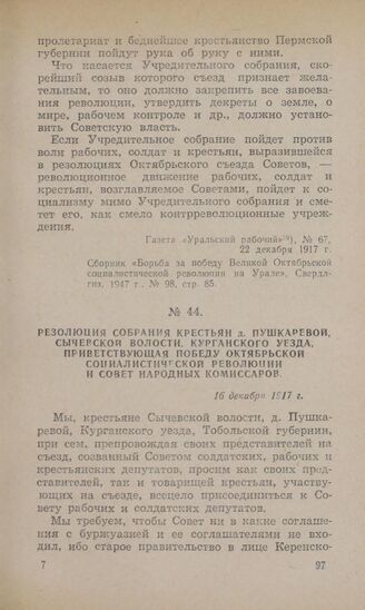 Резолюция собрания крестьян д. Пушкаревой, Сычевской волости Курганского уезда, приветствующая победу Октябрьской социалистической революции и Совет Народных Комиссаров. 16 декабря 1917 г. // Газета «Новый мир», № 82, 22 декабря 1917 г.