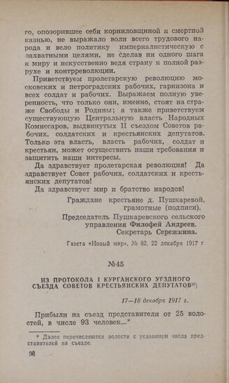 Из протокола I Курганского уездного съезда Советов крестьянских депутатов. 17—18 декабря 1917 г. // Газета «Новый мир», №№ 81 и 82, 21 и 22 декабря 1917 г.