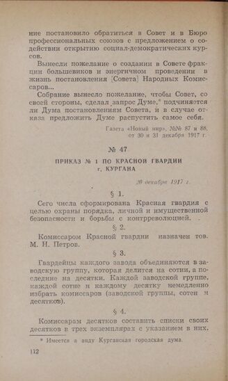 Приказ № 1 по Красной гвардии г . Кургана. 20 декабря 1917 г. // Газета «Новый мир», № 82, 22 декабря 1917 г.