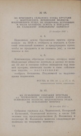 Из приговора сельского схода крестьян с. Шайтанского, Мехонской волости, Шадринского уезда, об отобрании церковных и части кулацких земель и передаче их сельскому земельному комитету. 23 декабря 1917 г. // ФОГАШ, ф. 589, oп. 1, д. 47, л. 15, машинописная копия, заверенная.