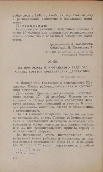 Из протокола II Курганского уездного съезда Советов крестьянских депутатов. 28 декабря 1917 г. // ГАКО, ф. 168, oп. 1, д. 17, лл. 3—7, типогр. экземпляр.