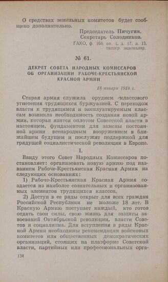 Декрет Совета Народных Комиссаров об организации Рабоче-Крестьянской Красной Армии. 18 января 1918 г. // Сборник законов и распоряжений Рабочего и Крестьянского Правительства, выпуск 2-й. Издание Московского облисполкома Советов рабочих, солдатских и крестьянских депутатов, г. Москва, 1918 г., стр. 78—79.