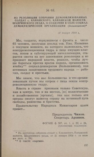 Из резолюции собрания демобилизованных солдат с. Канашского, Канашской волости, Шадринского уезда, о создании в селе социал-демократической организации (большевиков). 21 января 1918 г.