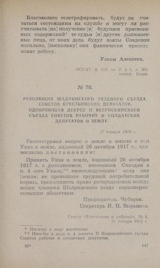 Резолюция Шадринского уездного съезда Советов крестьянских депутатов, одобряющая декрет II Всероссийского съезда Советов рабочих и солдатских депутатов о земле. 27 января 1918 г. // Газета «Крестьянин и рабочий», № 6, 31 января 1918 г.