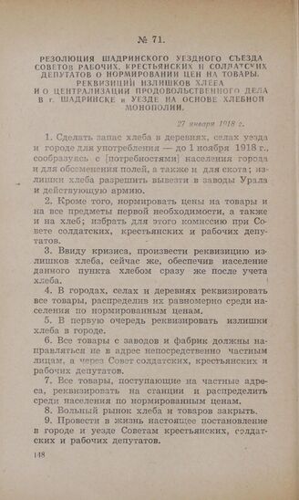 Резолюция Шадринского уездного съезда Советов рабочих, крестьянских и солдатских депутатов о нормировании цен на товары, реквизиции излишков хлеба и о централизации продовольственного дела в г. Шадринске и уезде на основе хлебной монополии. 27 января 1918 г. // ФОГАШ. ф. 589, oп. 1, д. 27, л. 65, машинописная копия, заверенная. Газета «Крестьянин и рабочий», № 6, 31 января 1918 г.