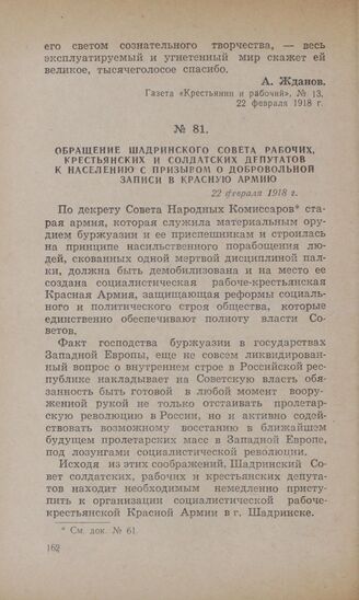 Обращение Шадринского Совета рабочих, крестьянских и солдатских депутатов к населению с призывом о добровольной записи в Красную Армию. 22 февраля 1918 г. // Газета «Крестьянин и рабочий», № 13, 22 февраля 1918 г.