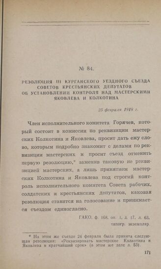 Резолюция III Курганского уездного съезда Советов крестьянских депутатов об установлении контроля над мастерскими Яковлева и Колкотина. 25 февраля 1918 г. // ГАКО, ф. 168, oп. 1, д. 17, л. 63, типогр. экземпляр.
