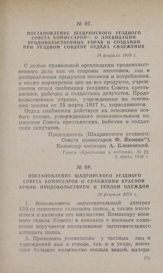 Постановление Шадринского уездного Совета комиссаров о снабжении Красной Армии продовольствием и теплой одеждой. 28 февраля 1918 г. // Газета «Крестьянин и рабочий», № 23, 6 марта 1918 г.
