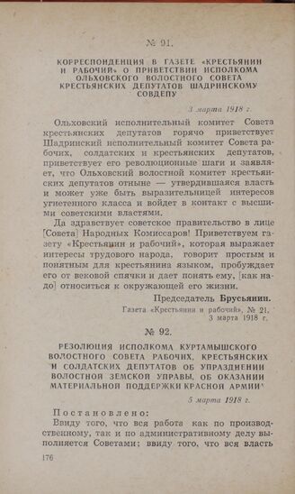 Резолюция исполкома Куртамышского волостного Совета рабочих, крестьянских и солдатских депутатов об упразднении волостной земской управы, об оказании материальной поддержки Красной Армии. 5 марта 1918 г.
