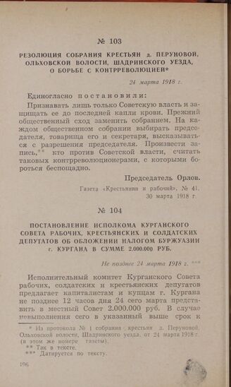 Постановление исполкома Курганского Совета рабочих, крестьянских и солдатских депутатов об обложении налогом буржуазии г. Кургана в сумме 2.000.000 руб. Не позднее 24 марта 1918 г. // Газета «Известия Курганского Совета рабочих, солдатских и крестьянских депутатов», № 54, 24 марта 1918 г.
