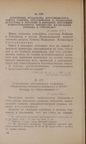 Резолюция исполкома Куртамышского Совета рабочих, крестьянских и солдатских депутатов о переходе в народное достояние конфискованного имущества владельцев Войнова и Гомзякова. 26 марта 1918 г. // ГАКО, ф. 32, oп. 1, д. 203, л. 16, рукописный подлинник.