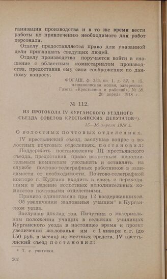 Из протокола IV Курганского уездного съезда Советов крестьянских депутатов. 15—16 апреля 1918 г. // ГАКО, ф. 168, oп. 1, д. 17, лл. 68—75, типогр. экземпляр.