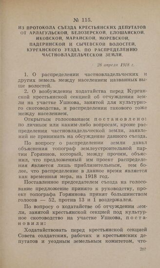 Из протокола съезда крестьянских депутатов от Арлагульской, Белозерской, Елошанской, Иковской, Марайской, Моревской, Падеринской и Сычевской волостей, Курганского уезда, по распределению частновладельческой земли. 28 апреля 1918 г.