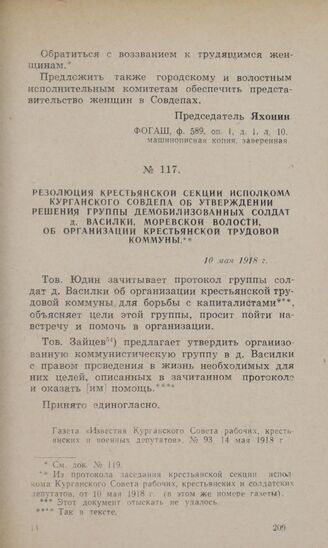 Резолюция крестьянской секции исполкома Курганского Совдепа об утверждении решения группы демобилизованных солдат д. Василки, Моревской волости, об организации крестьянской трудовой коммуны. 10 мая 1918 г. // Газета «Известия Курганского Совета рабочих, крестьянских и военных депутатов», № 93, 14 мая 1918 г.