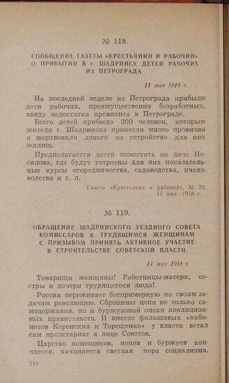 Сообщение газеты «Крестьянин и рабочий» о прибытии в г. Шадринск детей рабочих из Петрограда. 11 мая 1918 г. // Газета «Крестьянин и рабочий», № 70, 11 мая 918 г.