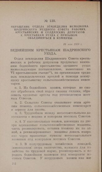 Обращение отдела земледелия исполкома Шадринского уездного Совета рабочих, крестьянских и солдатских депутатов к крестьянам уезда с призывом объединяться в коммуны. 18 мая 1918 г. // Газета «Крестьянин и рабочий», № 78, 21 мая 1918 г.