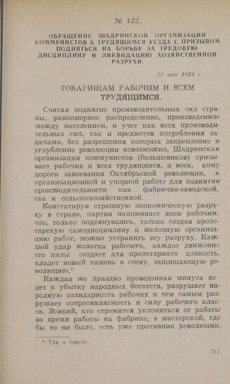 Обращение Шадринской организации коммунистов к трудящимся уезда с призывом подняться на борьбу за трудовую дисциплину и ликвидацию хозяйственной разрухи. 25 мая 1918 г. // Газета «Крестьянин и рабочий», № 81, 25 мая 1918 г.