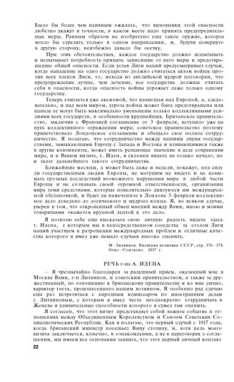 Речь г-на А. Идена на приеме 28 марта 1935 года // «Правда», № 87 (6333) от 29 марта 1935 г.