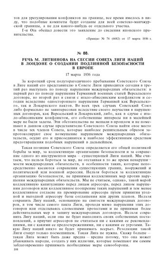 Речь М. Литвинова на сессии Совета Лиги Наций в Лондоне о создании подлинной безопасности в Европе. 17 марта 1936 года