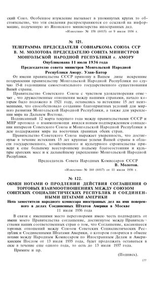 Телеграмма Председателя Совнаркома Союза ССР В.М. Молотова Председателю Совета Министров Монгольской Народной Республики г. Амору. Опубликована 11 июля 1936 года // «Известия», № 160 (6017) от 11 июля 1936 г.