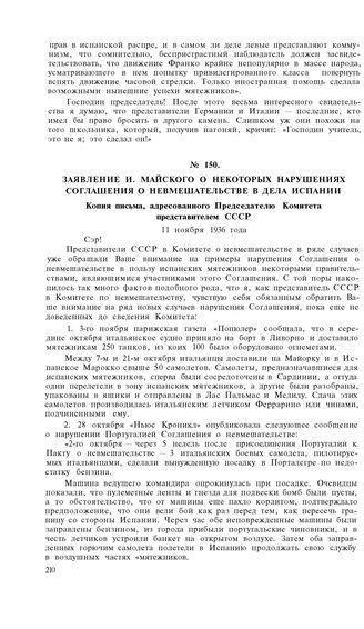 Заявление И. Майского о некоторых нарушениях соглашения о невмешательстве в дела Испании. Копия письма, адресованного Председателю Комитета представителем СССР. 11 ноября 1936 года