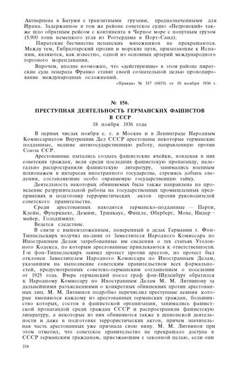 Преступная деятельность германских фашистов в СССР. 18 ноября 1936 года // «Правда», № 317 (6923) от 18 ноября 1936 г.