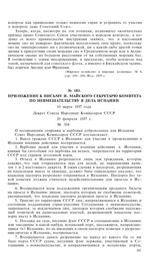 Приложение к письму И. Майского секретарю Комитета по невмешательству в дела Испании. 10 марта 1937 года. Декрет Совета Народных Комиссаров СССР № 304 от 20 февраля 1937 г.
