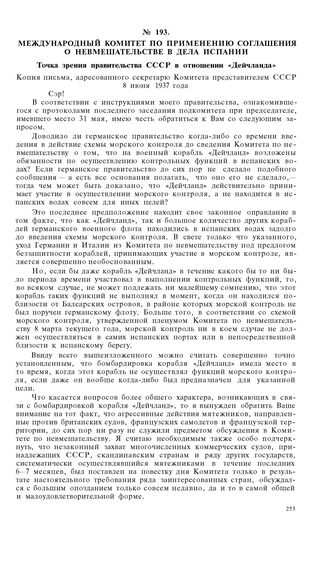 Международный Комитет по применению соглашения о невмешательстве в дела Испании. Точка зрения правительства СССР в отношении «Дейчланда». Копия письма, адресованного секретарю Комитета представителем СССР. 8 июня 1937 года