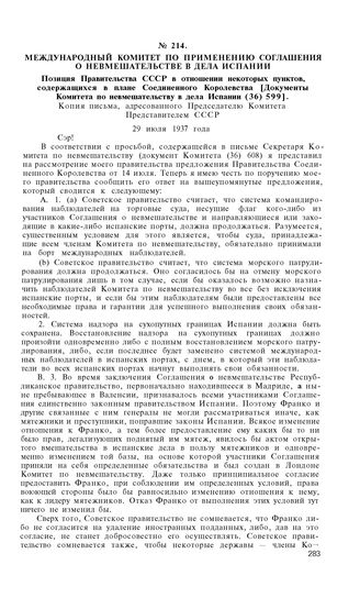 Международный Комитет по применению соглашения о невмешательстве в дела Испании. Позиция Правительства СССР в отношении некоторых пунктов, содержащихся в плане Соединенного Королевства [Документы Комитета по невмешательству в дела Испании (36) 599...