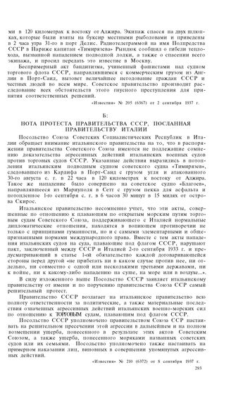 Нападение итальянских судов на суда СССР. Нота протеста правительства СССР, посланная правительству Италии // «Известия», № 210 (6372) от 8 сентября 1937 г.