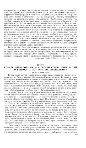 Речь М. Литвинова на 101-й сессии Совета Лиги Наций по вопросу о нейтралитете Швейцарии. 14 мая 1938 года