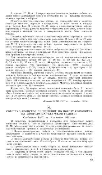 Конфликт на Монголо-Манчжурской границе в районе Халхин Гол. 11 мая-16 сентября 1939 года. Советско-японское соглашение по поводу конфликта на монголо-манчжурской границе. Сообщение ТАСС от 16 сентября 1939 года