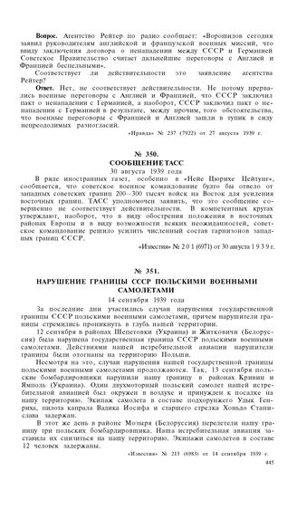Нарушение границы СССР польскими военными самолетами. 14 сентября 1939 года // «Известия», № 213 (6983) от 14 сентября 1939 г.