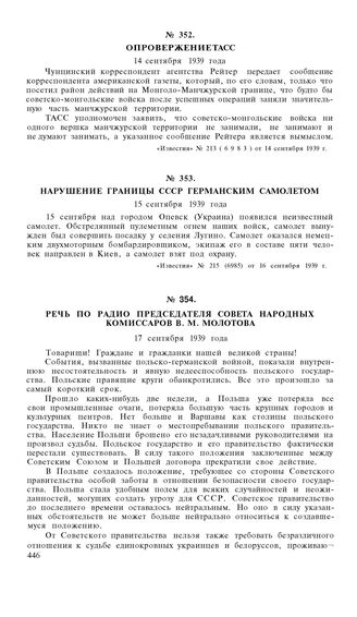 Нарушение границы СССР германским самолетом. 15 сентября 1939 года // «Известия», № 215 (6985) от 16 сентября 1939 г.