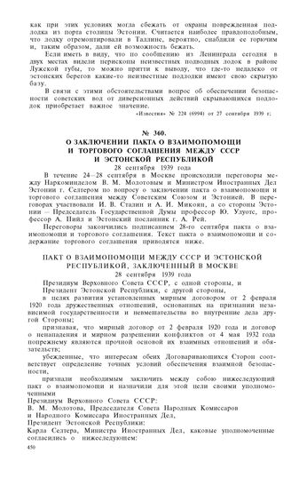 О заключении пакта о взаимопомощи и торгового соглашения между СССР и Эстонской республикой. 28 сентября 1939 года // «Известия», № 226 (6996) от 29 сентября 1939 г.