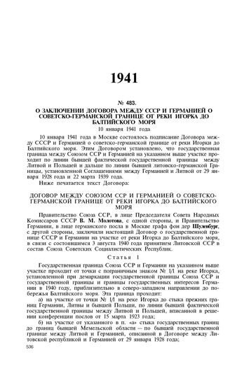 О заключении договора между СССР и Германией о советско-германской границе от реки Игорка до Балтийского моря. 10 января 1941 года // «Правда», № 11 (8419) от 11 января 1941 г.