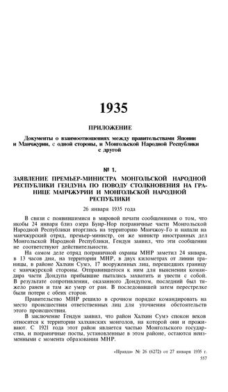 Заявление премьер-министра Монгольской Народной Республики Гендуна по поводу столкновения на границе Манчжурии и Монгольской Народной Республики. 26 января 1935 года // «Правда», № 26 (6272) от 27 января 1935 г.