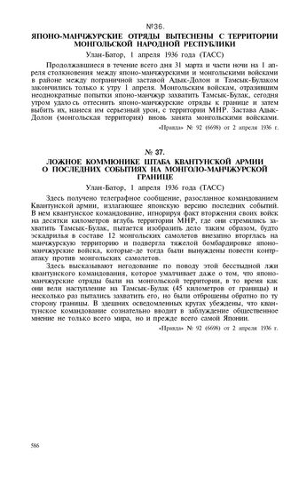 Ложное коммюнике штаба Квантунской армии о последних событиях на монголо-манчжурской границе. Улан-Батор, 1 апреля 1936 года (ТАСС) // «Правда», № 92 (6698) от 2 апреля 1936 г.