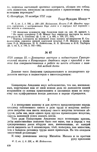 1758 января 12. — Доношение мастеров и подмастерьев Гравировальной палаты в Канцелярию Академии наук с просьбой о выдаче для совершенствования в работе по шести оттисков с каждой медной доски // Ф. 3, оп. 1, д. 228, л. 80. Подлинник.
