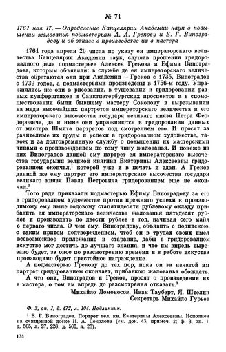 1761 мая 17. — Определение Канцелярии Академии наук о повышении жалованья подмастерьям А. А. Грекову и Е. Г. Виноградову и об отказе в производстве их в мастера // Ф. 3, оп. 1, д. 472, л. 104. Подлинник.