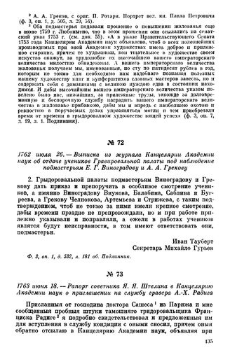 1762 июля 26. — Выписка из журнала Канцелярии Академии наук об отдаче учеников Гравировальной палаты под наблюдение подмастерьям Е. Г. Виноградову и А. А. Грекову // Ф. 3, оп. 1, д. 532, л. 181 об. Подлинник.