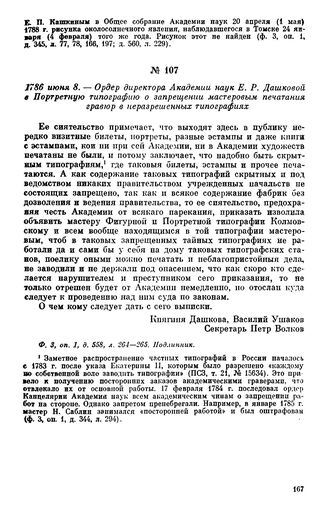 1786 июня 8. — Ордер директора Академии наук Е. Р. Дашковой в Портретную типографию о запрещении мастеровым печатания гравюр в неразрешенных типографиях // Ф. 3, оп. 1, д. 558, л. 264—265. Подлинник.