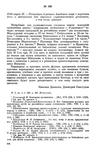 1788 марта 13. — Резолюция дирекции Академии наук с перечнем книг и материалов для обучения «художнических учеников», в том числе граверов