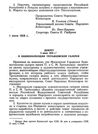 Декрет 3 июня 1918 г. О национализации Третьяковской галереи // Печатается по тексту книги: «Декреты Советской власти», т. II, 1959, стр. 389-390.